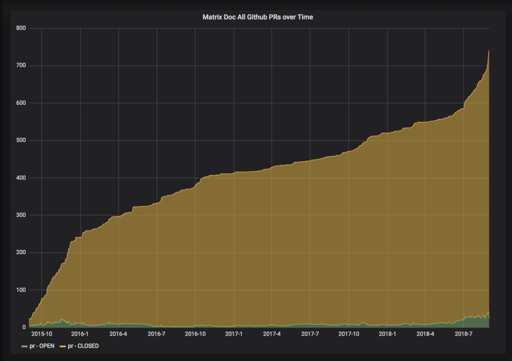Anyway, enough numerology. It's worth noting that all of the dev for r0 has generally followed the proposed Open Governance Model for Matrix, with the core spec team made up of both historical core team folk (erik, richvdh, dave & matthew), new core team folk (uhoreg & travis) and community folk (kitsune, anoa & mujx) working together to review and approve the changes - and we've been doing MSCs (albeit with an accelerated pace) for anything which we feel requires input from the wider community. Once the Server/Server r0 release is out the door we'll be finalising the open governance model and switching to a slightly more measured (but productive!) model of spec development as outlined there.